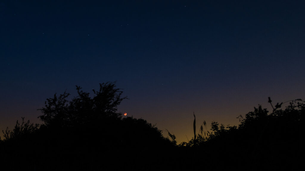 Pendant la montée, je peux profiter de l’avancée de l’éclipse, mais je ne m’attarde pas trop. J’ai quand même le réflexe d’installer mon trépied avant d’arriver au sommet, trouvant un cadre sympa avec la Lune surplombant un peu de végétation, histoire d’être sûr de pouvoir immortaliser le moment.