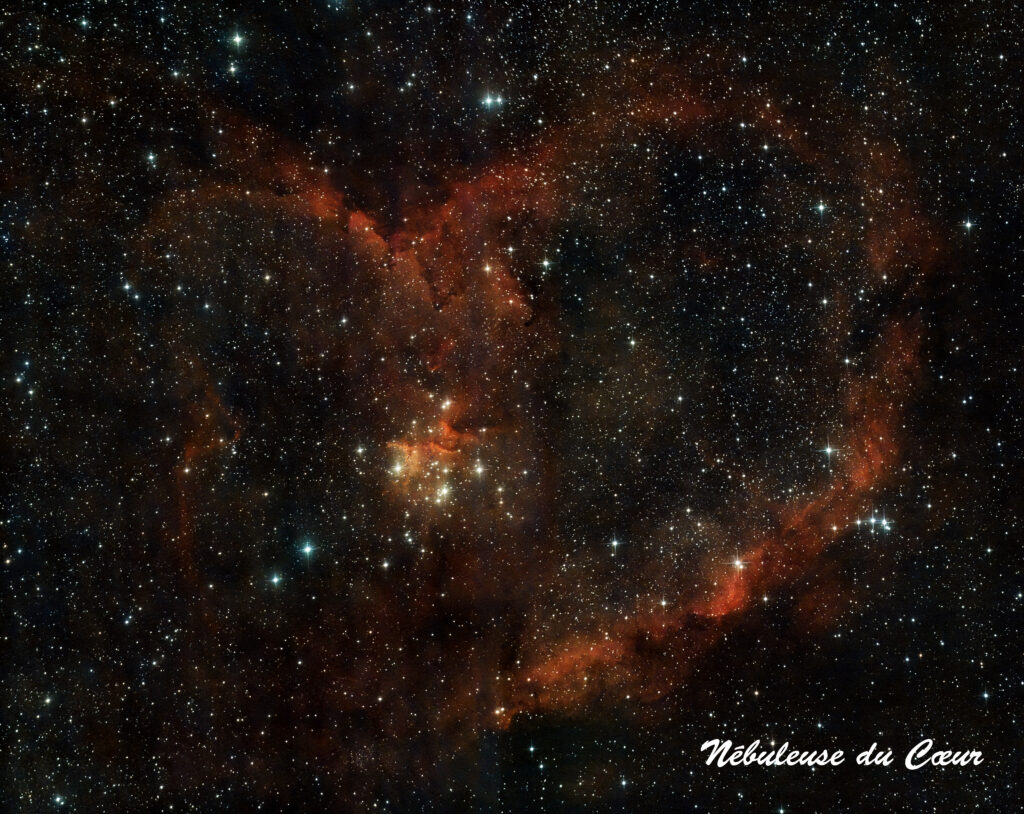 Quoi de mieux, évidemment, que la nébuleuse du Cœur (IC1805) ♥ pour cette occasion. Ça tombe bien, c’est le meilleur moment de l’année pour l’observer. Il va me falloir plusieurs nuit de prises de vue pour obtenir un résultat correct.