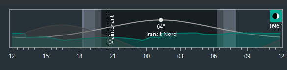 Deux explications à cela : le soleil se couche en début de nuit, et se lève en fin de nuit, donc les étoiles les moins lumineuses ne sont pas visibles, “cachées” par la très faible, mais néanmoins présente, lumière du soleil. Par ailleurs, plus la cible est haute dans le ciel, moins elle est impactée par la pollution lumineuse. Pour les deux galaxies, on voit sur l’image suivante qu’elles étaient au plus haut dans le ciel vers 1h30 :