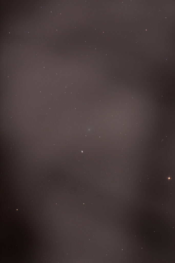 La première approche donc rapidement, j’ai déjà réussi à en prendre une petite photo toute floue le 23 novembre dernier, quand elle était encore loin de la Terre, et en plus avec un filtre pas du tout adapté pour une comète.