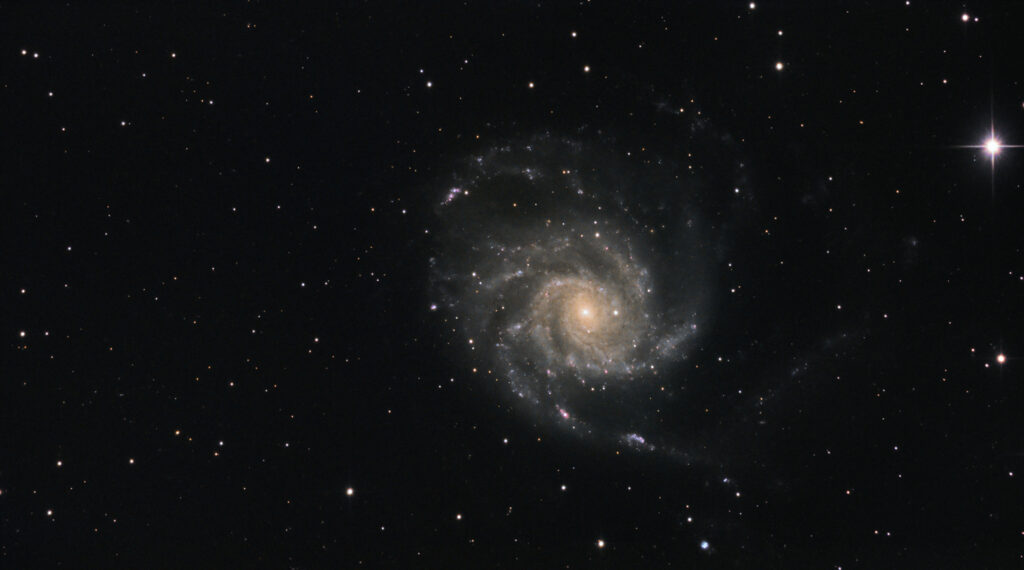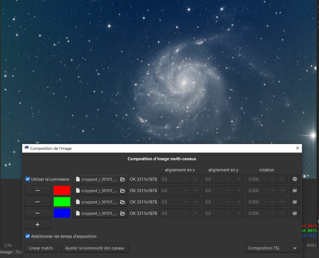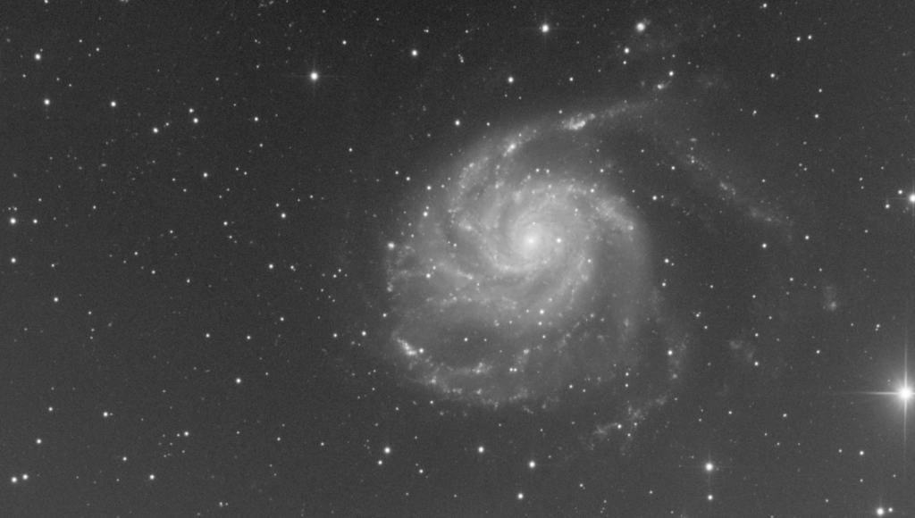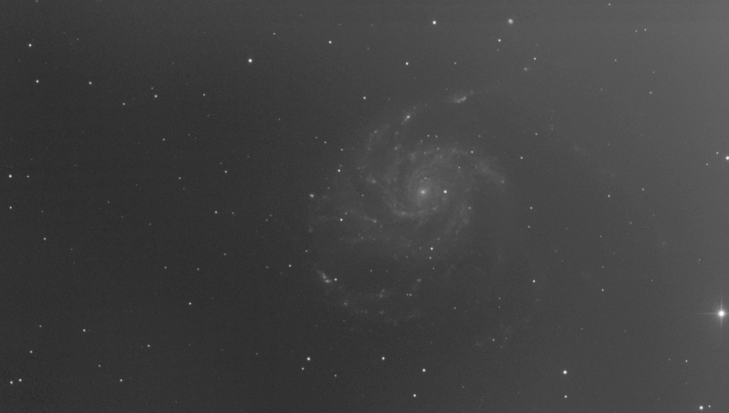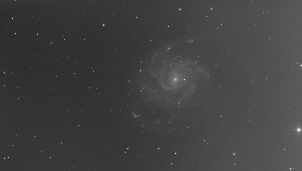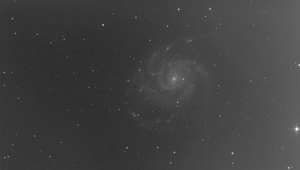 La veille j’ai pu installer, configurer et faire quelques images avec mon nouveau setup incluant la caméra monochrome + la roue à filtres. Je peux donc faire une session complète sur la galaxie M101, avec les filtres de luminance (L), rouge (R), vert (V) et bleu (B), pour obtenir une image en couleur.