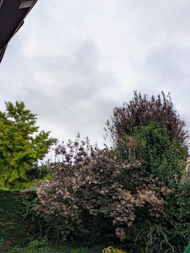C’est le week-end, pas besoin de se lever aux aurores, le soleil est assez haut dans le ciel et visible depuis mon jardin.