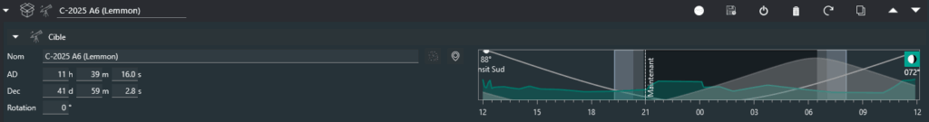 Cette nuit , je récupère, depuis le logiciel Stellarium, les coordonnées de la comète telles qu’elles seront à 5h30 (heure à laquelle je vais faire commencer les prises de vues). Ce sont ces coordonnées que je renseigne manuellement dans la séquence N.I.N.A.