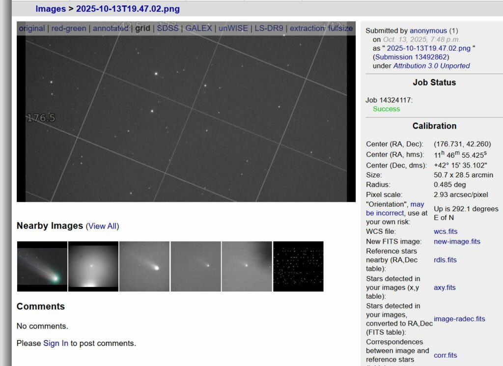 Je vérifie, avec nova.astrometry.net, les coordonnées de la première photo prise à 6h02 : RA: 11:46:55; Dec: 42° 15′ 35″