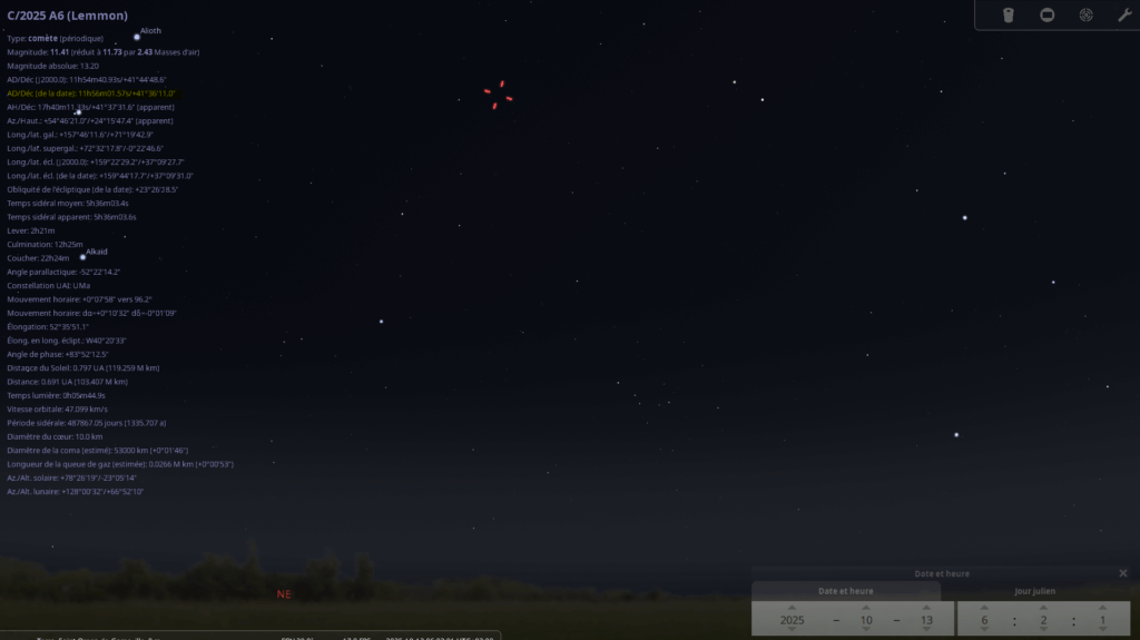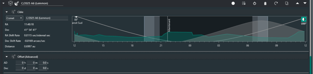 2025-10-13T05:50:00.1306|INFO|SequenceItem.cs|Run|208|Starting Category: * Jeu d'instructions *, Container: NINA.Joko.Plugin.Orbitals.SequenceItems.OrbitalObjectContainer, Strategy: SequentialStrategy, Items[CREATED]: 1, Triggers: Trigger: CenterAfterDriftTrigger, DistanceArcMinutes: 4Trigger: RestoreGuiding, Target: C/2025 A6 (Lemmon) RA: 11:54:36; Dec: 41° 44' 56"; Epoch: J2000 0, Target: C/2025 A6 (Lemmon) RA: 11:54:36; Dec: 41° 44' 56"; Epoch: J2000 0