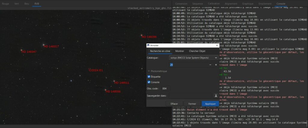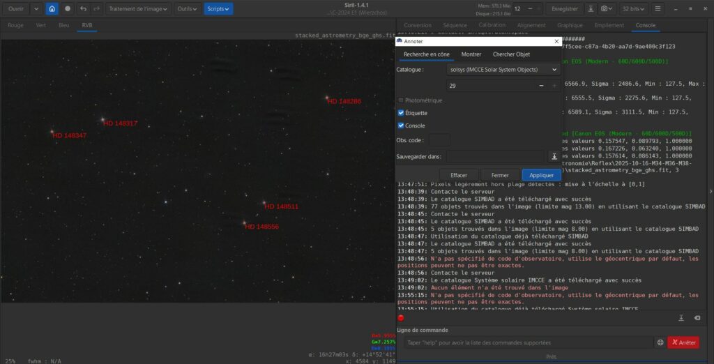 SIRIL permet d’annoter les objets présents dans l’image, avec l’outil « Astrométrie » -> « Annoter ». En utilisant le catalogue SIMBAD, on voit des étoiles annotées sur l’image. En utilisant le catalogue solsys je devrais voir les objets du système solaire (dont les comètes) annotés sur mon image. Malheureusement, j’ai l’erreur suivante dans le console SIRIL, et aucun objet du système solaire trouvé sur mon image 😔