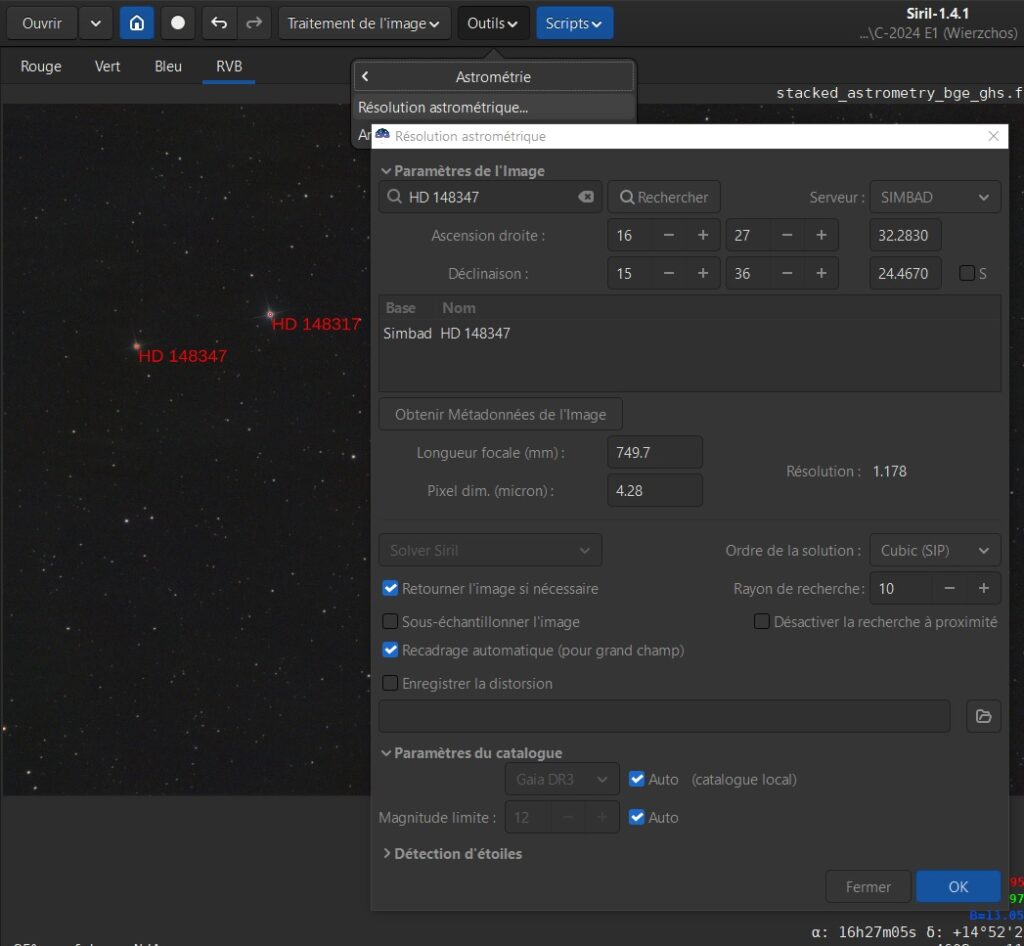 De retour dans SIRIL, je peux alors faire la résolution astrométrique de l’image, en entrant l’objet HD 148494 :