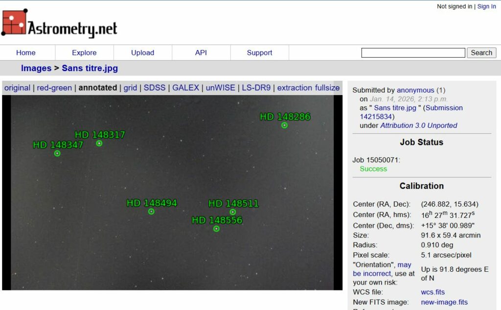 Première étape : je cherche les coordonnées de mon image avec le site https://nova.astrometry.net/ :