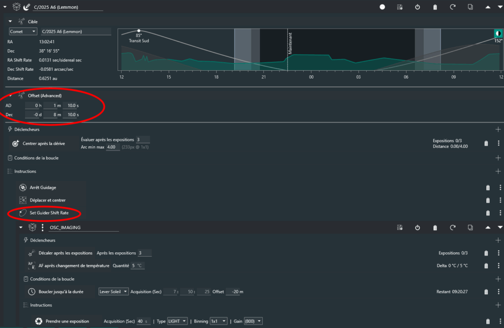 Je configure la séquence comme la nuit dernière, avec l’offset qui va bien, et je trouve une nouvelle instruction « Orbitals » : « Set Guider Shift Rate », qui est censée indiquer à la monture la vitesse de suivi à appliquer pour suivre la comète.