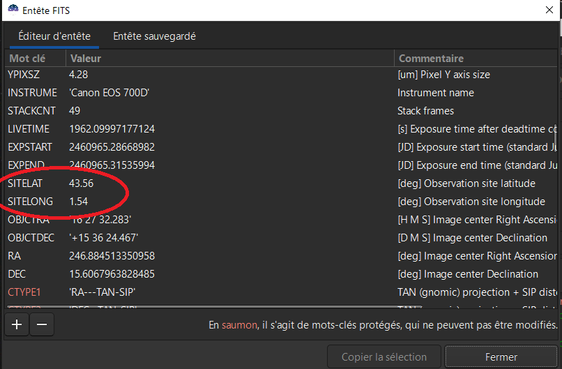 Deuxième méthode pour faire apparaitre l’annotation de la comète dans la photo : renseigner la latitute et longitude du lieu d’observation de la photo dans les entête FITS, avec les code SITELAT et SITELONG
