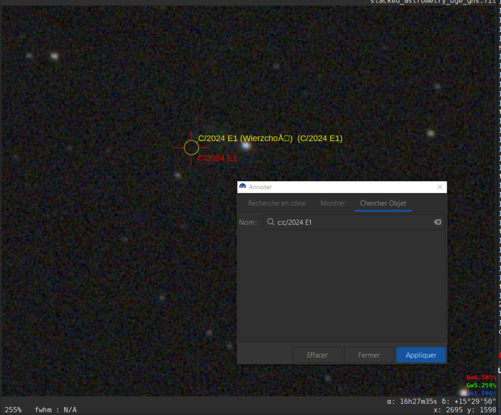 Puis, dans la fenêtre d’annotation, aller dans « Chercher Objet », et saisir le nom de la comète c:c/2024 E1