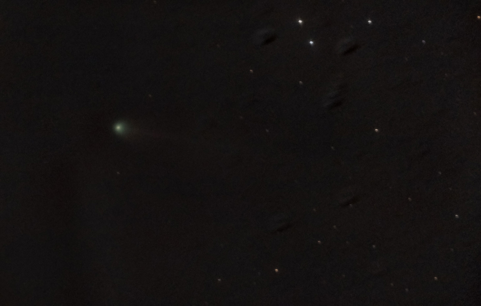 Je tente aussi quelques prises de vue sur C/2025 A6 (Lemmon) qui est visible juste après le coucher de soleil, mais bas sur l’horizon à travers les arbres 😏. Le résultat est donc, forcément, peu convaincant !